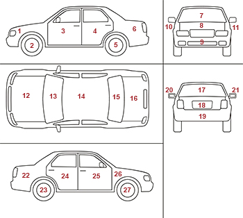 Bitte geben Sie die Zahl passend zum Bereich des Autos an und nennen Sie uns die entstandenen Schäden in diesem Bereich
